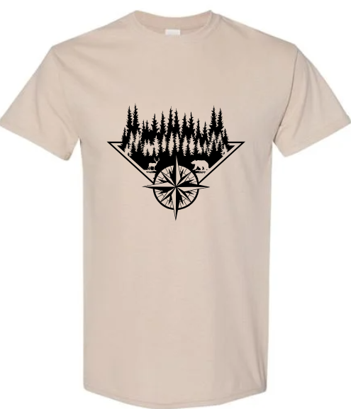 Embark on an adventure with our Forest Landscape with Compass Shirt. This black and white graphic tee captures the spirit of exploration and the beauty of nature. The design features a triangular landscape set against a backdrop of a compass, symbolizing guidance and direction. The landscape within the triangle is a serene depiction of mountains, trees, and a river, evoking the tranquility of a forest. Above it all, the sun shines brightly, adding a touch of warmth to the scene. This shirt is perfect for those who love to explore and have a deep connection with nature.