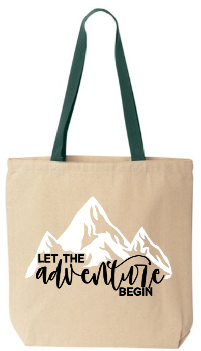 Let the Adventure Begin” tote: “Embark on your next adventure with our ‘Let the Adventure Begin’ tote. Featuring a stunning mountain graphic in the background and bold lettering, this tote is perfect for any adventure seeker. Made from high-quality materials, it’s durable and spacious, making it the perfect companion for your travels. Whether you’re exploring new trails or simply running errands, this tote is sure to become a favorite.